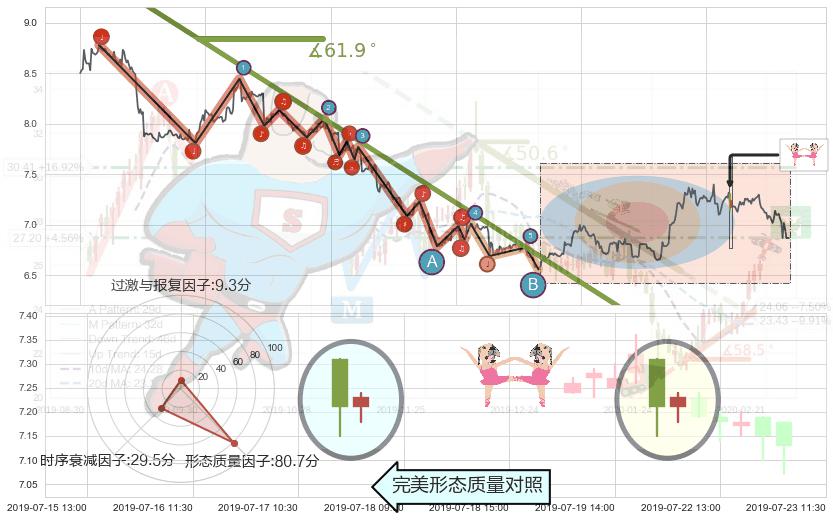 从2019-03-15 09:30至2019-06-20 15:00,共包含384个小时,阶段股价下跌-22.62%,阶段股价变动位移路程比: 1 : 7,下跌趋势角度: 61.9