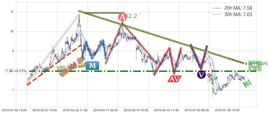 2019-06-26: 时域附近第一阻力位7.96持续的对下跌趋势进行阻拦,有效地放缓了下跌的速度。