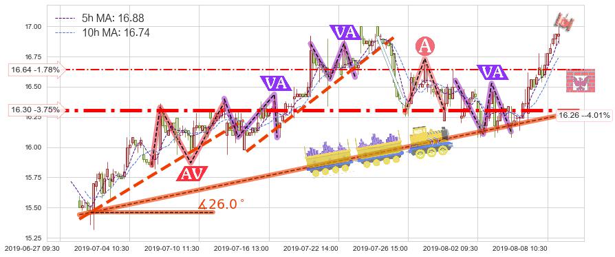 ♘ 在最后的上升阶段2019-06-28 10:30至2019-08-08 15:00存在 持续未破位的支撑位 ,支撑价格16.26,支撑可信任强度87.99%,其距离最后价格16.94相差 -4.01%