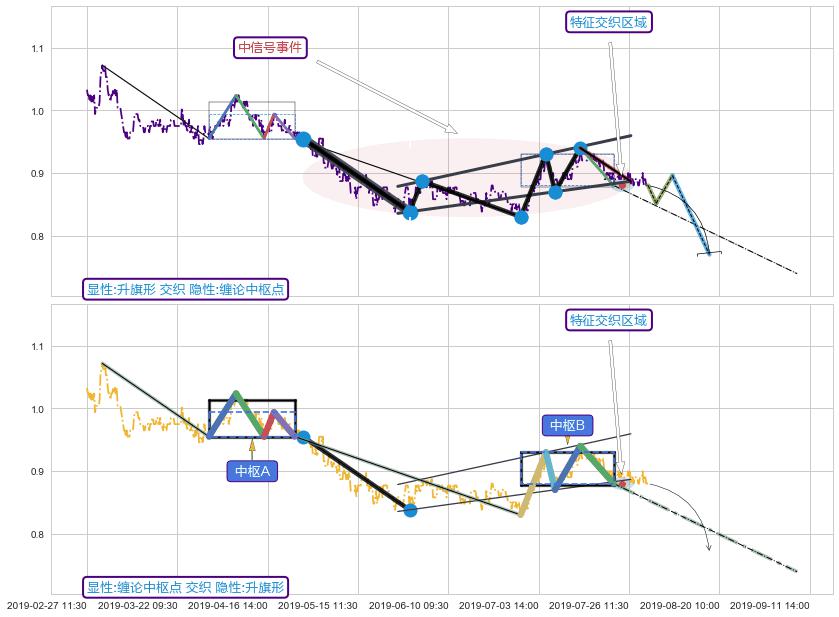 ➣ 缠论中枢点:猜想破位中枢B后持续下拉 → 下跌 → 破位中枢B支撑 → 持续趋势跟踪