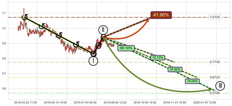 ➢ 循环浪继续向下【最低】位置(01-13:14, 0.5700),匹配聚类样本比例24.17%, 可能性概率14.04%