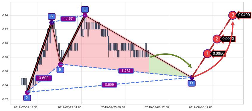 ➣ 谐波赛福:c下跌临近d:猜想拉升 → 上涨 →【拐点】强支撑临近 → 大趋势均值回复