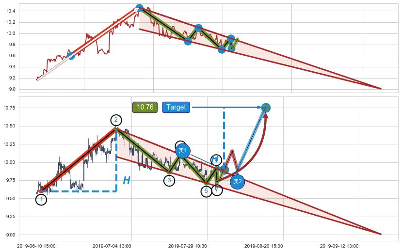 ➣ ['回调abc识别为: 【锯齿型调整浪】 ', '锯齿型:子浪535结构 ⓑ点振幅较小,ⓒ点继续发力远超ⓐ点结束位置']