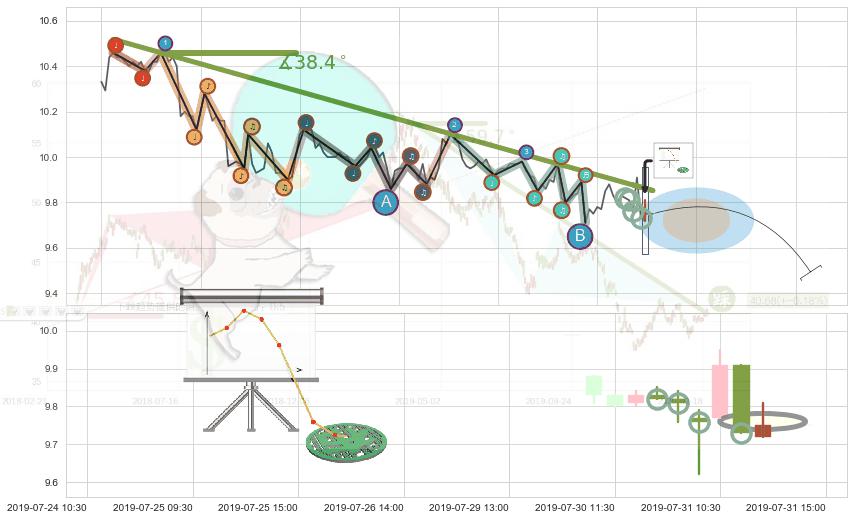 从2019-06-28 10:30至2019-07-31 09:30,共包含132个小时,阶段股价下跌-6.74%,阶段股价变动位移路程比: 1 : 6,下跌趋势角度: 38.4