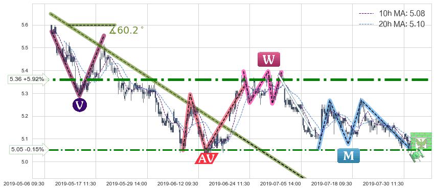 ♘ 阻力价格位5.36,可信任强度97.14%,距离最后交易2019-07-31 15:00形成的收盘价格5.06相差 +5.92%