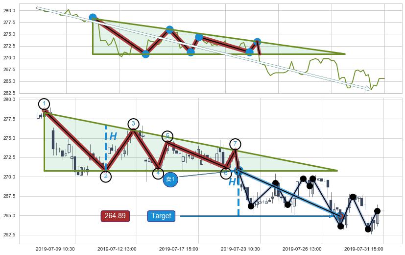 ➣ 下降三角整理:下跌target达成后 → 猜想下跌动能竭尽反转上涨 → 机会信号 → 大趋势均值回复