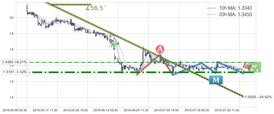 从2019-05-06 09:30至2019-07-05 15:00,共包含252个小时,阶段股价下跌-34.70%,阶段股价变动位移路程比: 1 : 8,下跌趋势角度: 56.5,2019-06-11 09:30向↘︎形成缺口,跳空下跌-17.88%˚