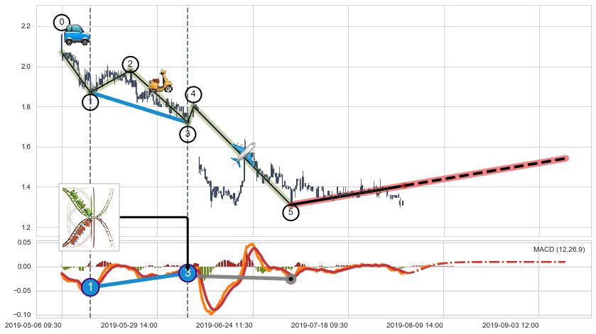 ➣ 趋势线:阻力位已击穿突破,猜想持续向上拉升上涨 → 上涨 →【突破】机会信号 → 大周期均值回复