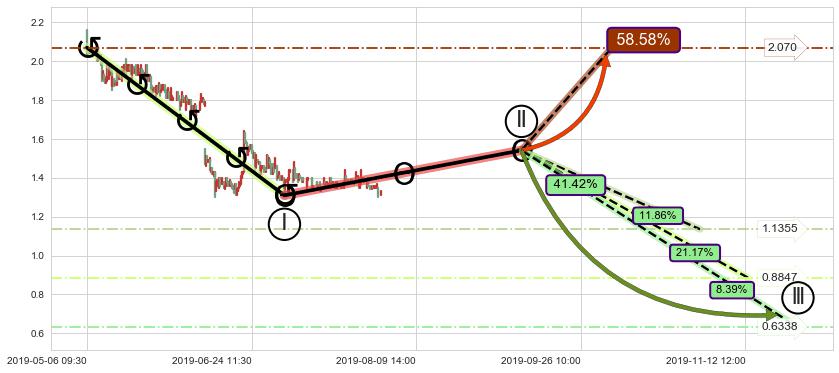 从2019-06-19 10:30至2019-07-04 09:30,共包含60个小时,阶段股价上涨1.68%,阶段股价变动位移路程比: 1 : 54