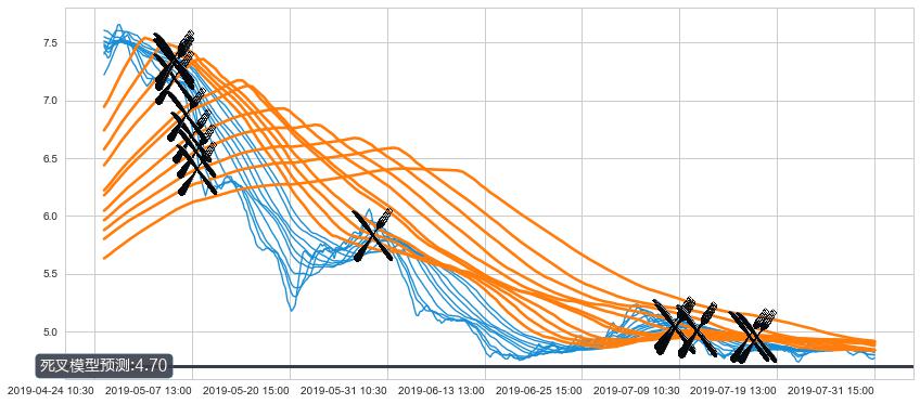 ➣ 40小时均线于(05-03 15:00: 7.32)形成【死叉】基于【死叉历史模型】预测死叉后最低波谷价格: 6.68, 死叉后最低价格4.70,已经下跌超出预测最低波谷价格, 预期反弹