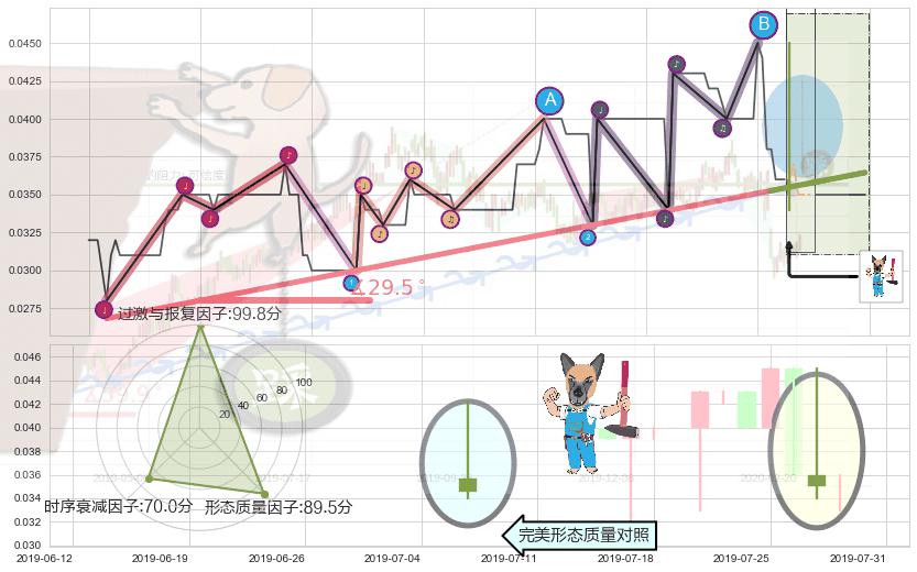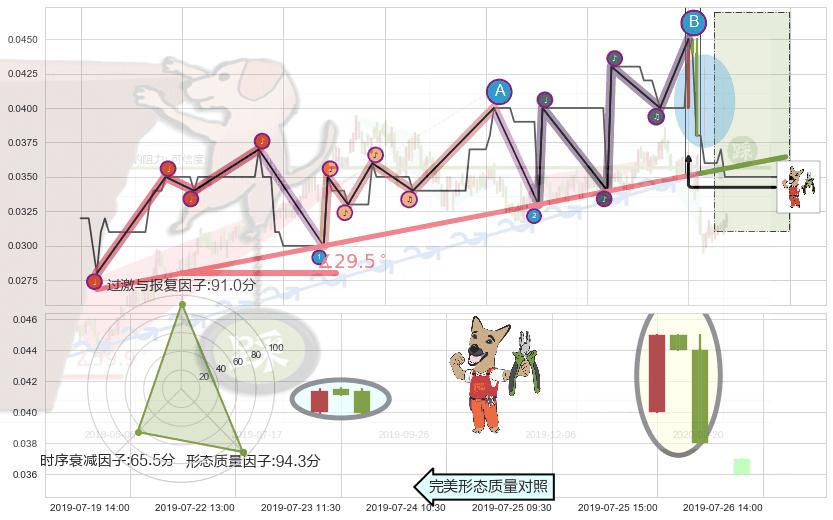 ➢ 2019-06-20 13:00-2019-07-26 11:30上升趋势存在反转[风险],虽然原上升趋势的支撑位(0.0364528)已破位,但其支撑效果尚存,原上升趋势角度: 29.5˚