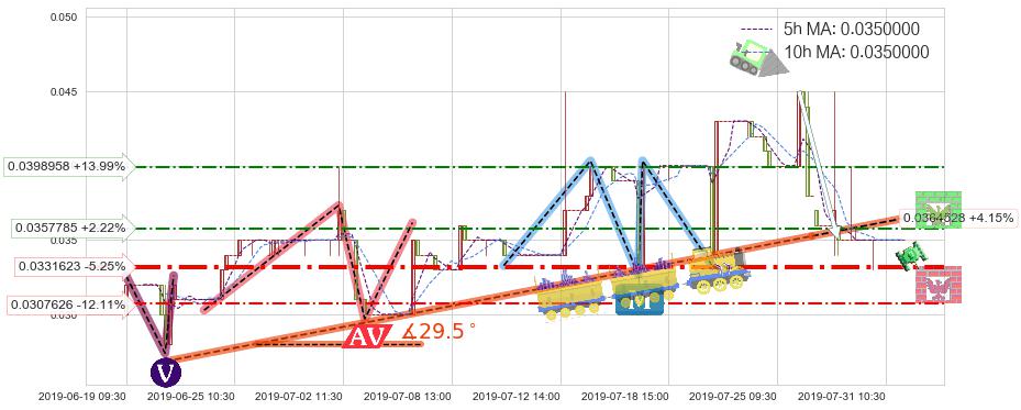➣ 2019-06-20 13:00-2019-07-26 11:30上升趋势存在反转[风险],虽然原上升趋势的支撑位(0.0364528)已破位,但其支撑效果尚存,原上升趋势角度: 29.5˚