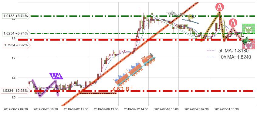 ♘ 阻力价格位1.9133,可信任强度72.67%,距离最后交易2019-07-31 15:00形成的收盘价格1.8100相差 +5.71%