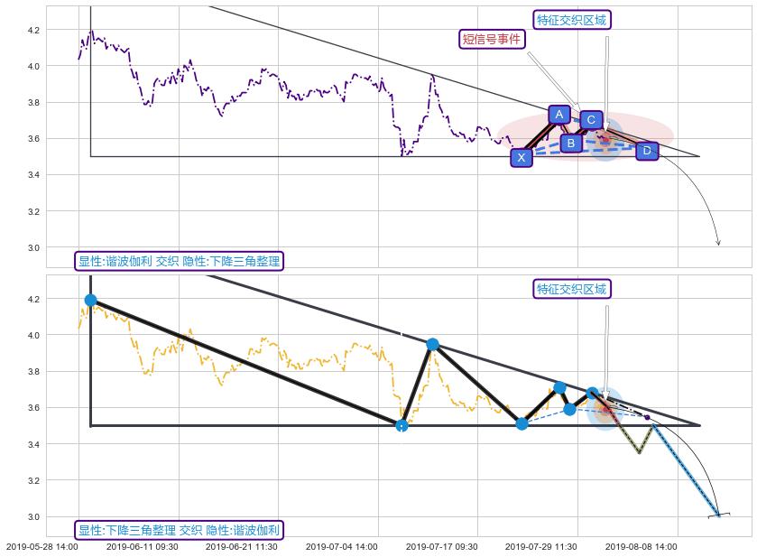 ➢ 谐波伽利属【短级别信号事件】下降三角整理属【长级别信号事件】长短周期组合信号事件, 短长事件长度比16.92%