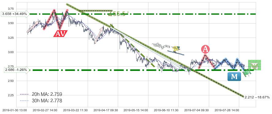 ♘ 阻力价格位2.686,可信任强度90.47%,距离最后交易2019-07-31 15:00形成的收盘价格2.720相差 -1.26%