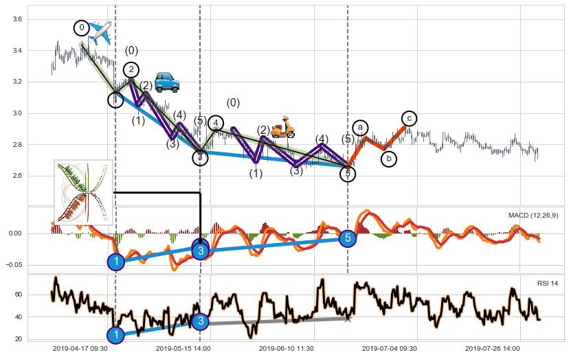 ➣ 第一, 三, 五浪下跌动能逐渐【衰弱变小】,趋势呈现不稳迹象