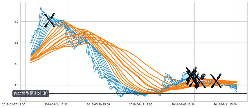 ➣ 34小时均线于(07-05 15:00: 4.74)形成【死叉】基于【死叉历史模型】预测死叉后最低波谷价格: 4.55, 死叉后最低价格4.33,已经下跌超出预测最低波谷价格, 预期反弹
