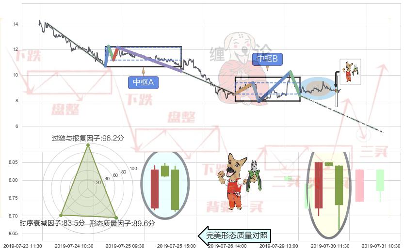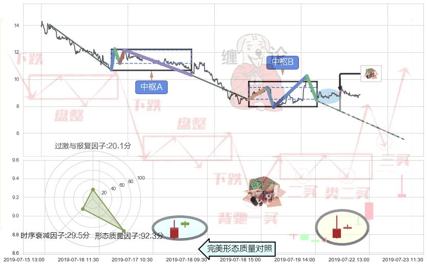 ➣ 下跌镊子线(n形磁铁) + 缠论中枢点破位中枢B支撑下拉信号叠加后【信号初始稳固度】偏低,【看空】信号叠加【可信度影响降权】