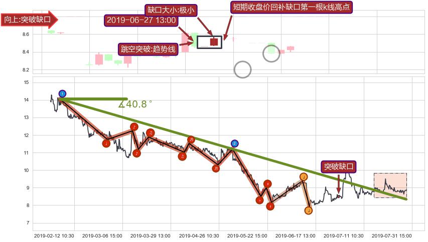 ⚔️ 2019-01-30 15:00-2019-06-17 10:30下跌趋势存在反转上涨[机会],虽然原下跌趋势的阻力位(8.34)已被突破,但其阻力效果尚存,原下跌趋势角度: 40.8˚