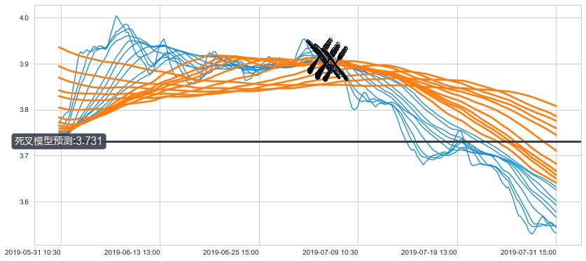 ➣ 90小时均线于(07-05 10:30: 3.899)形成【死叉】基于【死叉历史模型】预测死叉后最低波谷价格: 3.719, 死叉后最低价格3.520,已经下跌超出预测最低波谷价格, 预期反弹