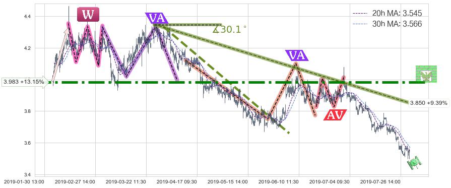 2019-07-02: 第一阻力位3.983强力阻拦了上升趋势,成功阻止了价格的继续上涨。