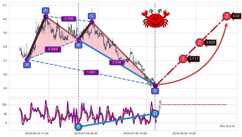 ➣ 谐波螃蟹:已到达d点:猜想c下行到达d点后报复性拉升上涨(均值回复)