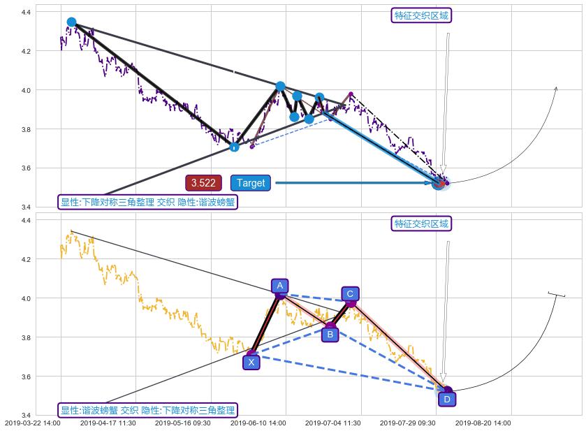 ➢ 下降对称三角整理与谐波螃蟹信号事件周期长度级别相同,同周期信号事件
