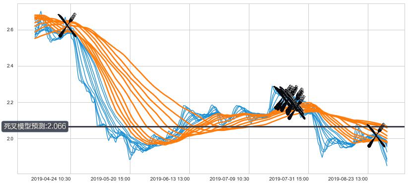 ➣ 120小时均线于(07-26 10:30: 2.169)形成【死叉】基于【死叉历史模型】预测死叉后最低波谷价格: 2.054, 死叉后最低价格1.8100,已经下跌超出预测最低波谷价格, 预期反弹