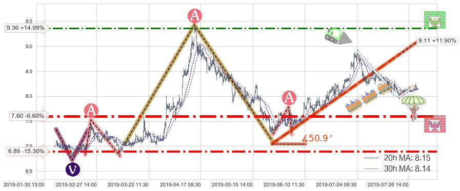 ♘ 支撑价格位7.60,可信任强度93.52%,距离最后交易2019-07-31 15:00形成的收盘价格8.14相差 -6.60%