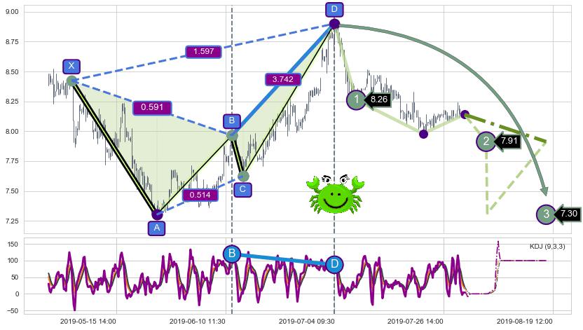 ➣ 谐波螃蟹:已到达d点:猜想c拉升到达d点后泄力性下沉下跌(均值回复)