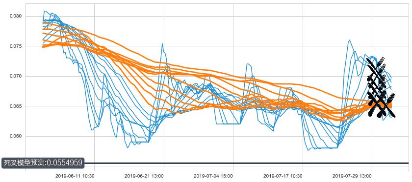 ➢ 90小时均线于(07-31 09:30: 0.0649889)形成【死叉】基于【死叉历史模型】预测死叉后最低波谷价格: 0.0546169, 死叉后最低价格0.0630000,尚未达到预测最低波谷价格, 预期继续下跌
