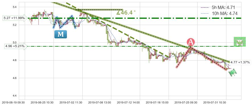 ➣ 预测:2019-08-09 15:00,【试探阻力】稳定目前下跌趋势的前提下,预测价格:4.59