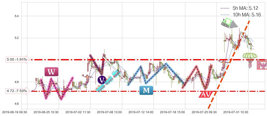 ♘ 支撑价格位5.00,可信任强度84.07%,距离最后交易2019-07-31 15:00形成的收盘价格5.10相差 -1.91%