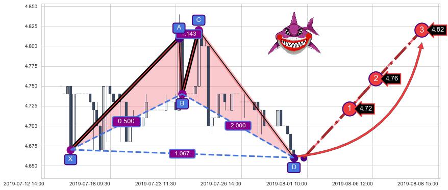➣ 已完成【鲨鱼】形态起点X: 07-16:09, 终点D: 07-31:11, 共69交易小时