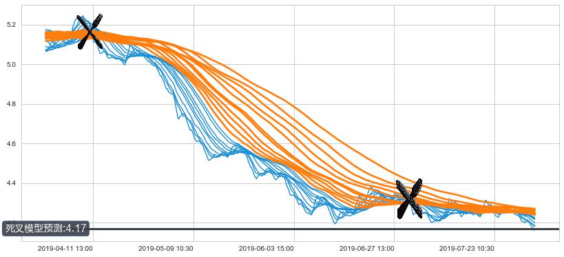 ➣ 40小时均线于(07-02 15:00: 4.33)形成【死叉】基于【死叉历史模型】预测死叉后最低波谷价格: 4.17, 死叉后最低价格4.14,已经下跌超出预测最低波谷价格, 预期反弹