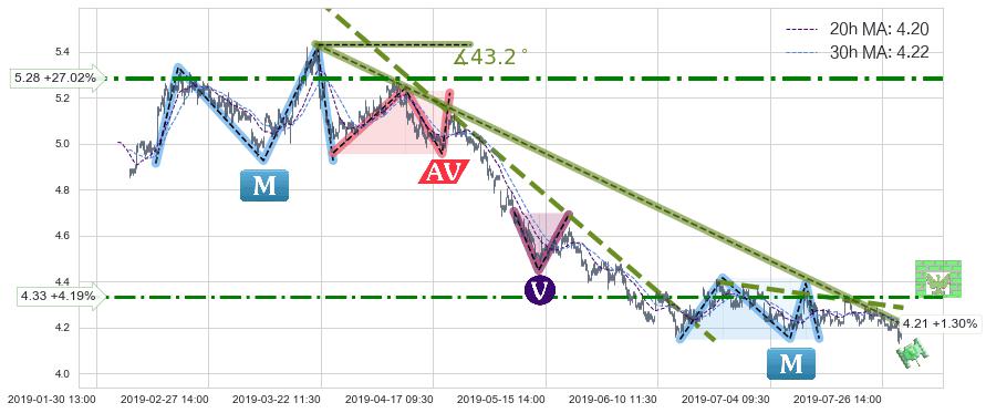 🦴 长线均值回复组合短线趋势跟踪[强阻力信号]2019-03-21 13:00-2019-07-31 15:00下跌趋势依然成立(下跌趋势跟踪依然存在),短线价格略微上行反弹(均值回复猜想),即将接近下跌趋势提供的未破位阻力价格:4.21。