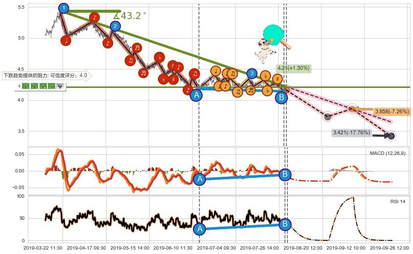 ➣ 预测:2019-09-05 12:00,【试探阻力】稳定目前下跌趋势的前提下,预测价格:3.858