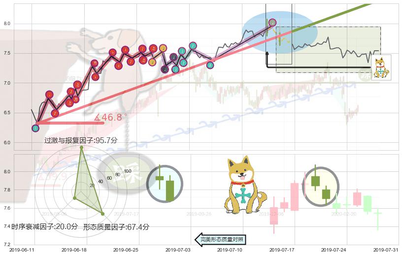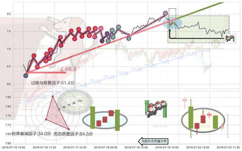 从2019-06-21 15:00至2019-07-23 09:30,共包含122个小时,阶段股价上涨19.73%,阶段股价变动位移路程比: 1 : 4,上涨趋势角度: 46.8