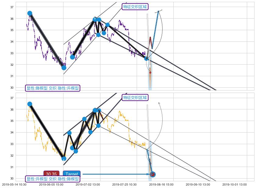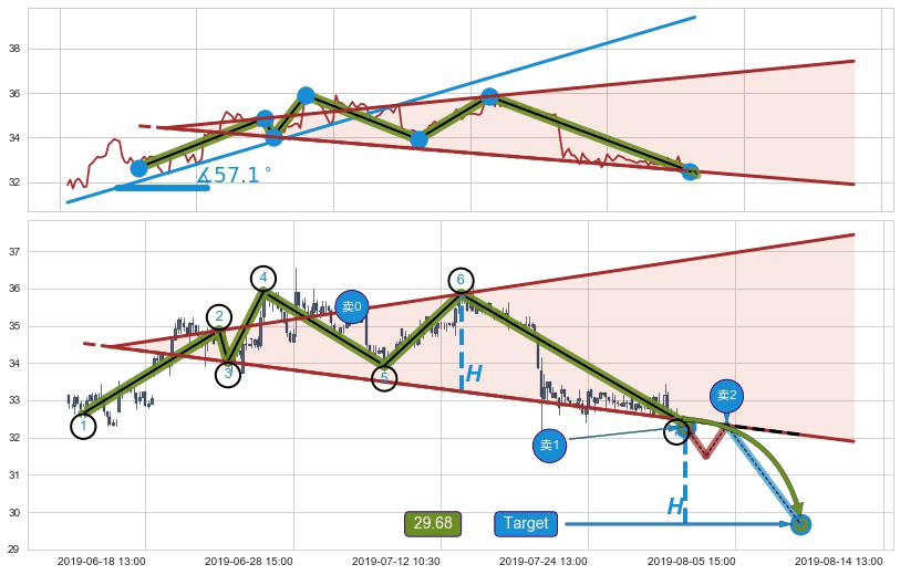 ➣ 扩散三角反转:猜想临近关键支撑位突破点 → 临近拐点下跌 → 风险信号 → 大趋势均值回复