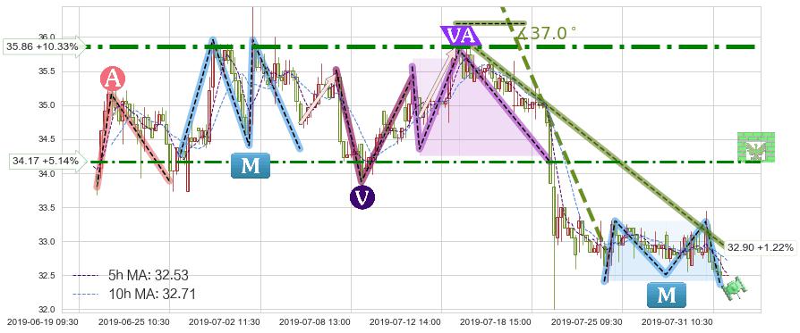 ➣ 预测:2019-08-06 15:00,【试探阻力】稳定目前下跌趋势的前提下,预测价格:31.88