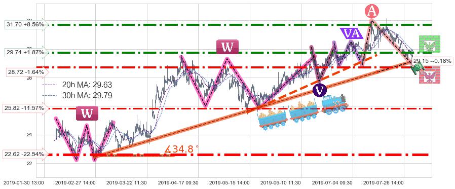 🍖 长线趋势跟踪组合短线均值回复[强支撑信号]2019-02-27 11:30-2019-07-16 09:30上升趋势依然成立(上涨趋势跟踪依然可行),短线价格略微下行回调(均值回复猜想),即将接近趋势提供的未破位的支撑价格:29.15。
