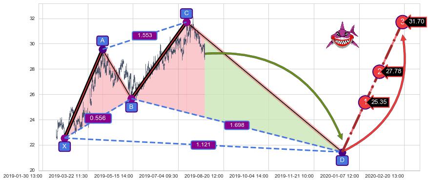 ➢ 距离预测D点位置有足够的下跌空间, 与看涨【鲨鱼】形态相反,实际方向【看跌】