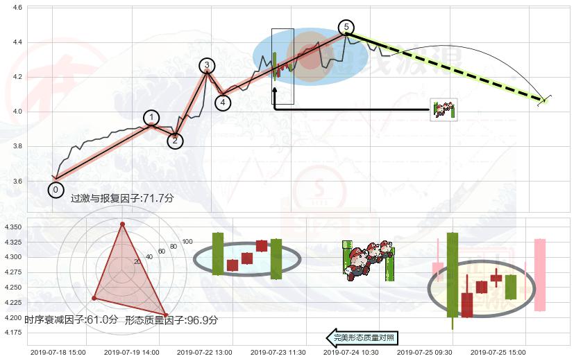 ➢ 🕰 价格走势在2019-07-25 09:30:00至2019-07-25 14:00:00期间形成下降三部曲(降势三鹤),残存影响值:-6.21