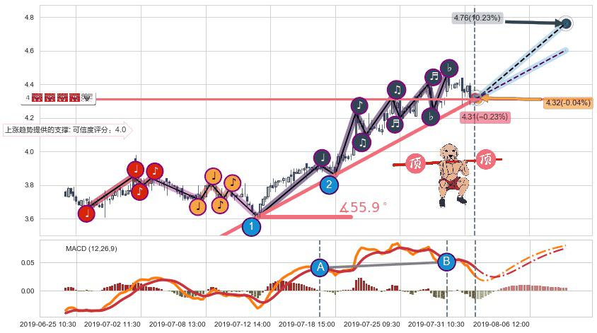 ➣ 预测:2019-08-08 14:00,【继续上扬】稳定目前上涨趋势的前提下,预测价格:4.76