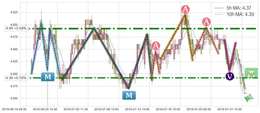 ♘ 阻力价格位4.39,可信任强度82.74%,距离最后交易2019-07-31 15:00形成的收盘价格4.36相差 +0.72%