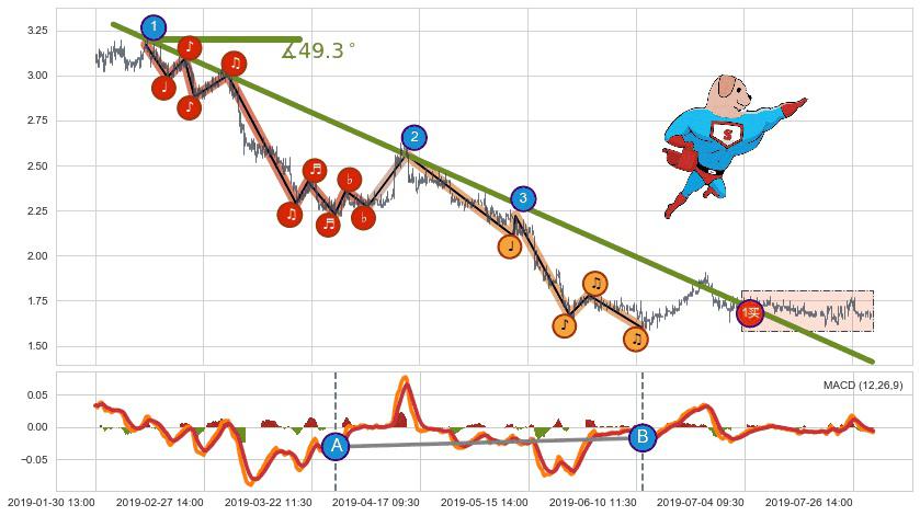 ➢ 最后的下跌趋势2019-02-04 11:30至2019-06-24 13:00:存在突破迹象,后续小反弹或者反转上涨