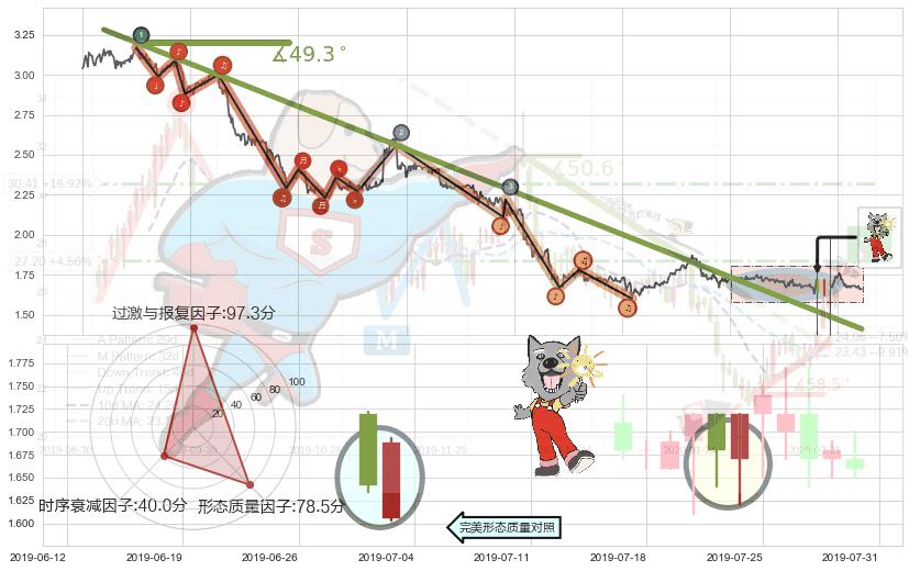 从2019-02-04 11:30至2019-06-24 13:00,共包含545个小时,阶段股价下跌-50.09%,阶段股价变动位移路程比: 1 : 8,下跌趋势角度: 49.3