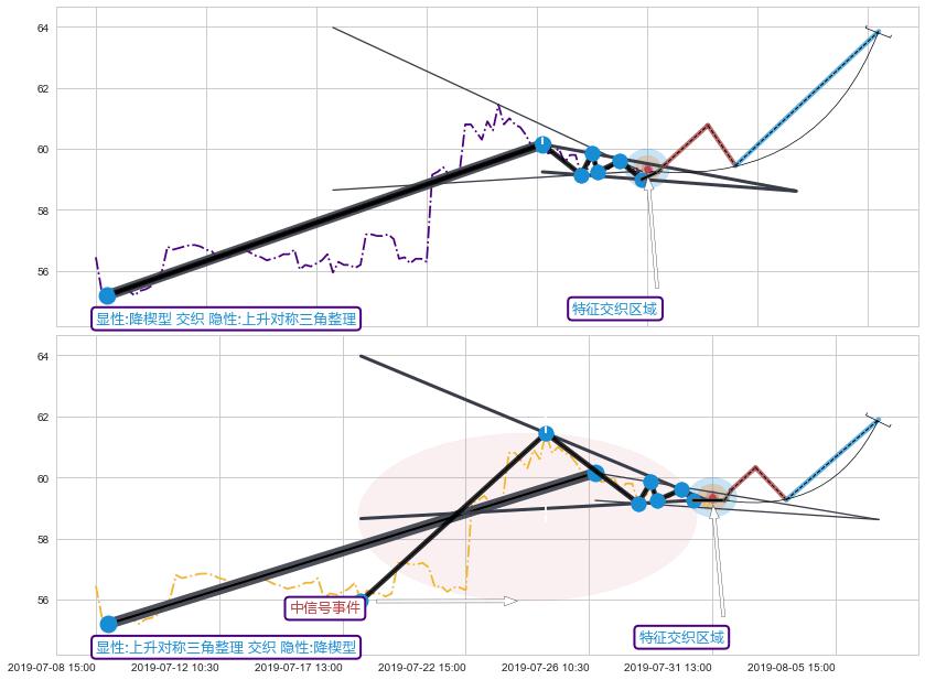 ➢ 上升对称三角整理属【中级别信号事件】降楔型属【长级别信号事件】中长周期组合信号事件,中长事件长度比54.46%
