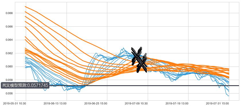 ➢ 30小时均线于(07-04 15:00: 0.0618333)形成【死叉】基于【死叉历史模型】预测死叉后最低波谷价格: 0.0598547, 死叉后最低价格0.0550000,已经下跌超出预测最低波谷价格, 预期反弹