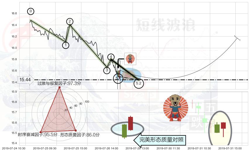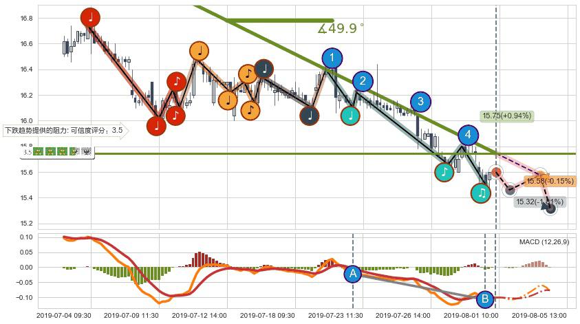 ➣ 预测:2019-08-05 10:00,【试探阻力】稳定目前下跌趋势的前提下,预测价格:15.58